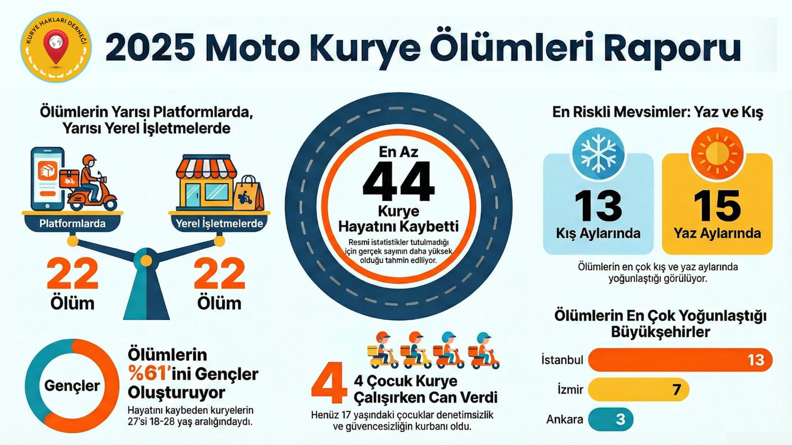 Moto Kurye Ölümlerine Genel Bakış bölümü, çalışırken yaşamını yitiren 44 kuryenin ne zaman, nerede, kaç yaşında, hangi aylarda, mevsimlerde ve hangi işyeri ve şirketlerde çalıştıkları gibi verileri paylaşıyor. Sektörde süregiden sömürü koşulları, paket başı ödeme ve hız temelli prim sistemi, düşük ücretler, uzun çalışma saatleri, eksik ve kalitesiz ekipman, zorlu hava koşullarında çalışmaya zorlanma ve etkisiz denetim mekanizmaları gibi faktörlerin kuryelerin yaşam hakkını etkilediği ifade ediliyor. Metin, bu yıl hayatını kaybeden kuryelerin çoğunluğunun 28 yaş altı gençlerden oluştuğunu ortaya koyarken 4 kuryenin çocuk yaşta olduğuna dikkat çekiyor. Ayrıca hayatını kaybeden kuryelerin yarısının dijital platformlara çalışan kuryeler olduğuna işaret edilerek esnaf-kuryelik olarak adlandırılan sistemin işçi sağlığı ve güvenliği açısından ciddi şekilde ele alınması gerektiğinin altı çiziliyor.